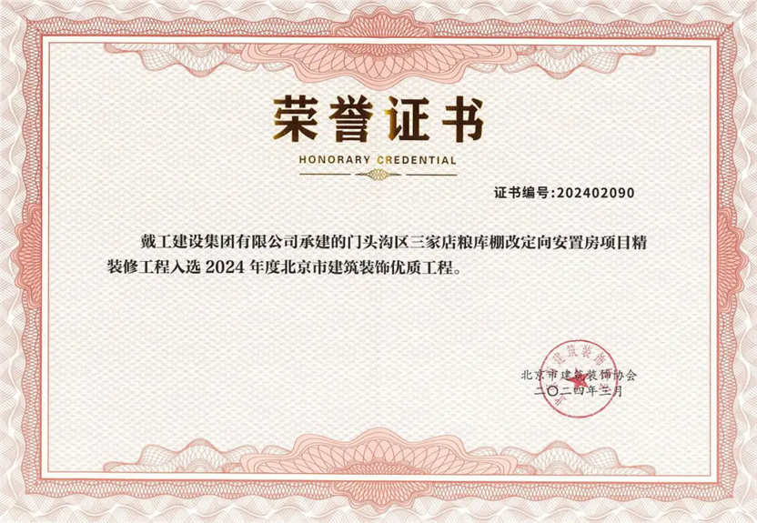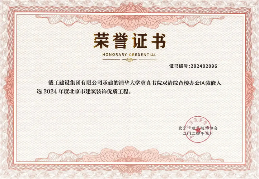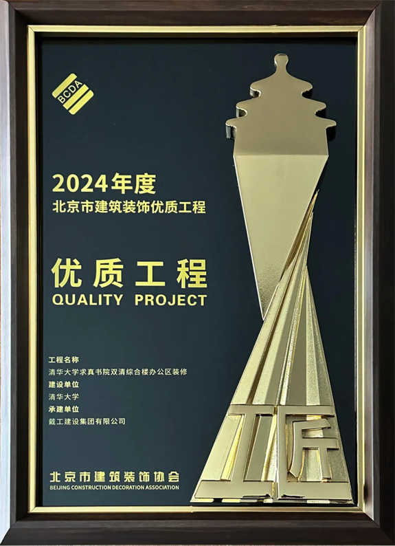 同時,2023-2024年度北京市建筑裝飾優(yōu)質(zhì)工程質(zhì)量評價結(jié)果及施工組織設(shè)計競賽也在會議中公布,戴工集團憑借精湛的施工工藝和嚴格的品質(zhì)把控,所承建的“門頭溝三家店糧庫棚改定向安置房項目精裝工程”以及“清華大學(xué)求真書院雙清綜合樓辦公區(qū)裝修項目”均獲得2024年度北京市建筑裝飾優(yōu)秀工程獎!